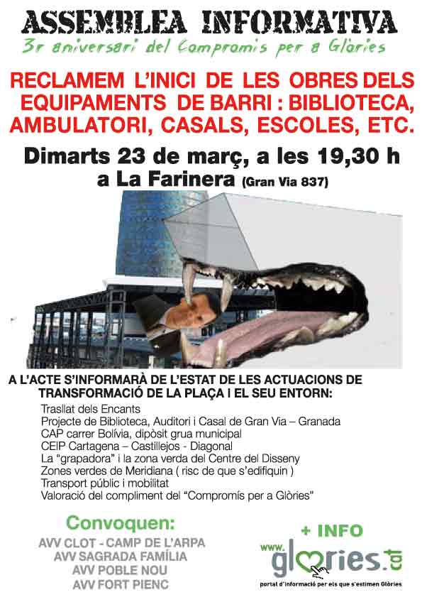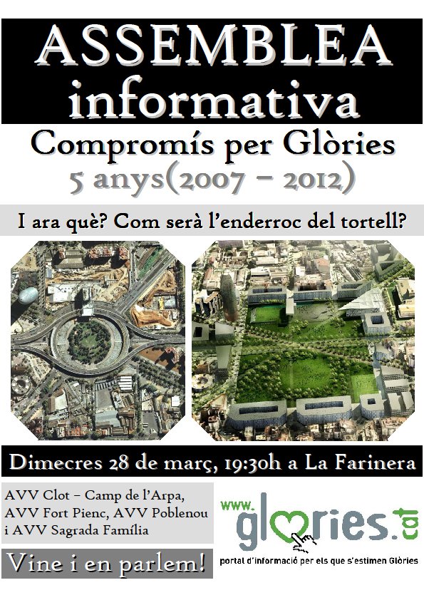 S'acosta el 5è aniversari de la signatura del Compromís per a Glòries 2007-2013. Com cada any les quatre AVV estem preparant una assemblea informativa veïnal oberta, on us farem un balanç retrospectiu i de futur del què ha passat i passarà a la plaça de les Glòries Catalanes.