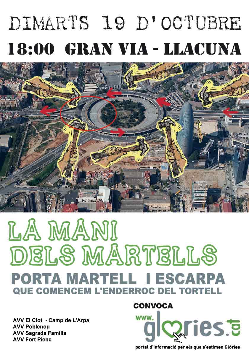 Les associacions de veïns dels quatre barris que envolten la plaça de les Glòries han presentat un manifest reivindicatiu per reclamar a l'Ajuntament que no endarrereixi més l'enderroc del tambor viari. Denuncien que el govern de Trias ha estat incapaç d'articular una majoria i asseguren que amb el ritme inversor actual caldrien encara 20 anys més per finalitzar les actuacions previstes.